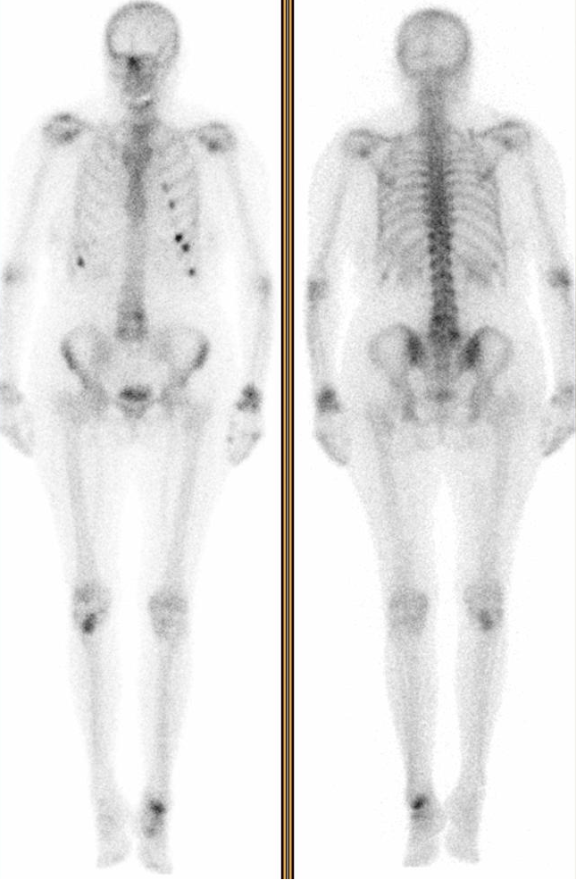Scintigraphie osseuse réalisée dans le bilan de douleurs costales post traumatiques chez une patiente de 65 ans.