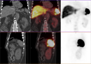 Scintigraphie à l’octreo-scan réalisée intialement dans l’hypothèse d’une TNE : fixation très faible du nodule de la queue du pancréas.